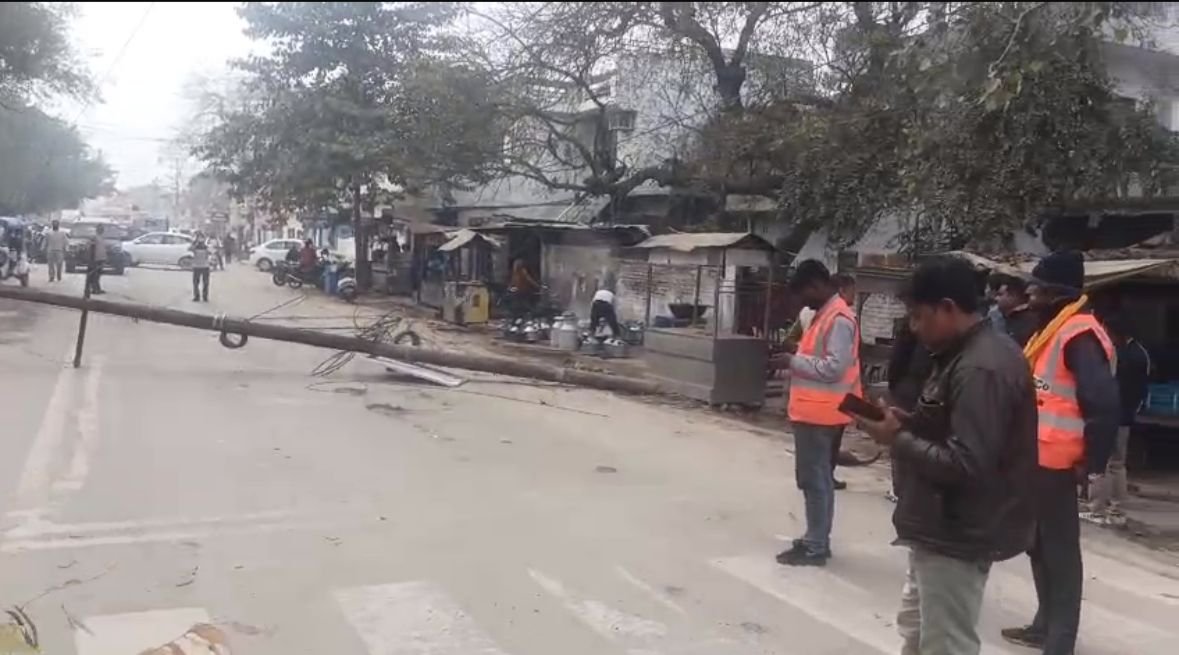 किदवई नगर में सड़ा बिजली पोल सड़क पर गिरा, यातायात रहा बाधित